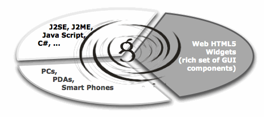 Gravity architecture uses set of abstractions to make it maximal portable on different platforms (J2ME, J2SE, Eclipse, .NET, etc) and different languages (Java, C#, JavaScript, etc). Core project has been written in Java but all developed GUI components are independent from any dedicated Java library like SWING or AWT. Everything what Gravity UI components abstraction requires is graphical canvas where simple rendering operations can be performed and basic input events can be handled. That is exactly what new HTML5 standard gives and what new Zebra project will utilize.